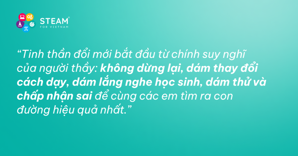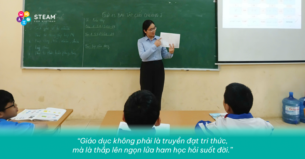 Cơ duyên đến với STEAM for Vietnam bắt đầu từ những trăn trở ấy. Khi tìm hiểu về những phương pháp giáo dục tích cực, cô Chi biết đến STEAM – mô hình tích hợp liên môn, giúp học sinh học qua trải nghiệm và giải quyết các vấn đề thực tiễn.