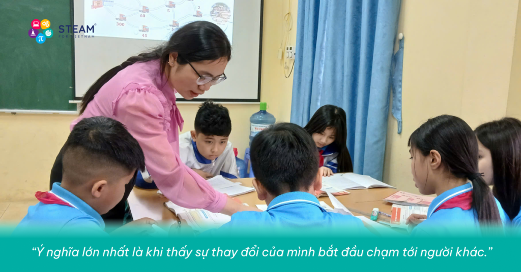 Là một Giáo viên Đại sứ của STEAM for Vietnam, điều khiến cô tự hào nhất là được chia sẻ những gì mình biết với mọi người. Cô tin rằng, mỗi chiến dịch và hoạt động mình tham gia không chỉ góp phần xây dựng cộng đồng giáo viên năng động, sáng tạo hơn, mà còn gieo những thay đổi – dù nhỏ – cho học trò, đồng nghiệp và cả cộng đồng nơi cô sống.